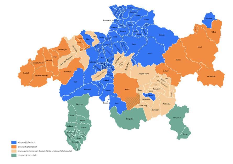Das rätoromanische Sprachgebiet teilt sich in verschiedene Regionen und fünf Idiome auf: Von der Val Müstair über das Engadin bis in die Surselva sprechen 14% der Bündner Bevölkerung die vierte Landessprache.